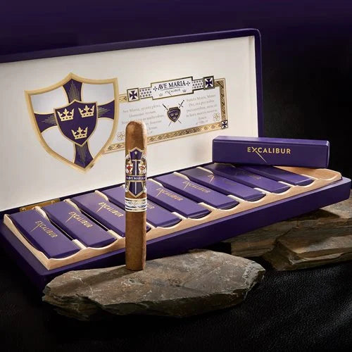 he Ave Maria Excalibur is the first in this lineup to sport a delicate yet flavor-packed Cameroon wrapper. Sporting a medium to full body, this prestigious combination of premium Nicaraguan long-fillers bound in a Habano leaf live in equilibrium. Smooth, balanced, yet thick and chewy flavors dash across your tongue after each puff. With hearty notes of spice, almonds, and a breadiness, you'll believe you're the next King of England! Packed in stately coffins and available only in a beefy Toro size, these treasure chests are regal in their own right. This is the cigar for you if you're searching for big flavors, top-notch construction, and superb blending!